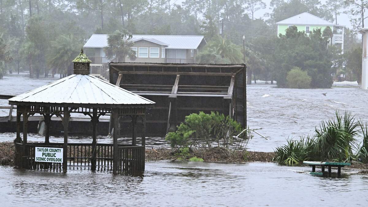 Dangerous storm surge inundating Cedar Key, Florida with the strongest hurricane in this region since the 1800s. 10-12 feet of storm surge. Debris and structures damaged by the power of the water. This is the most significant storm surge in the nature coast in recorded history